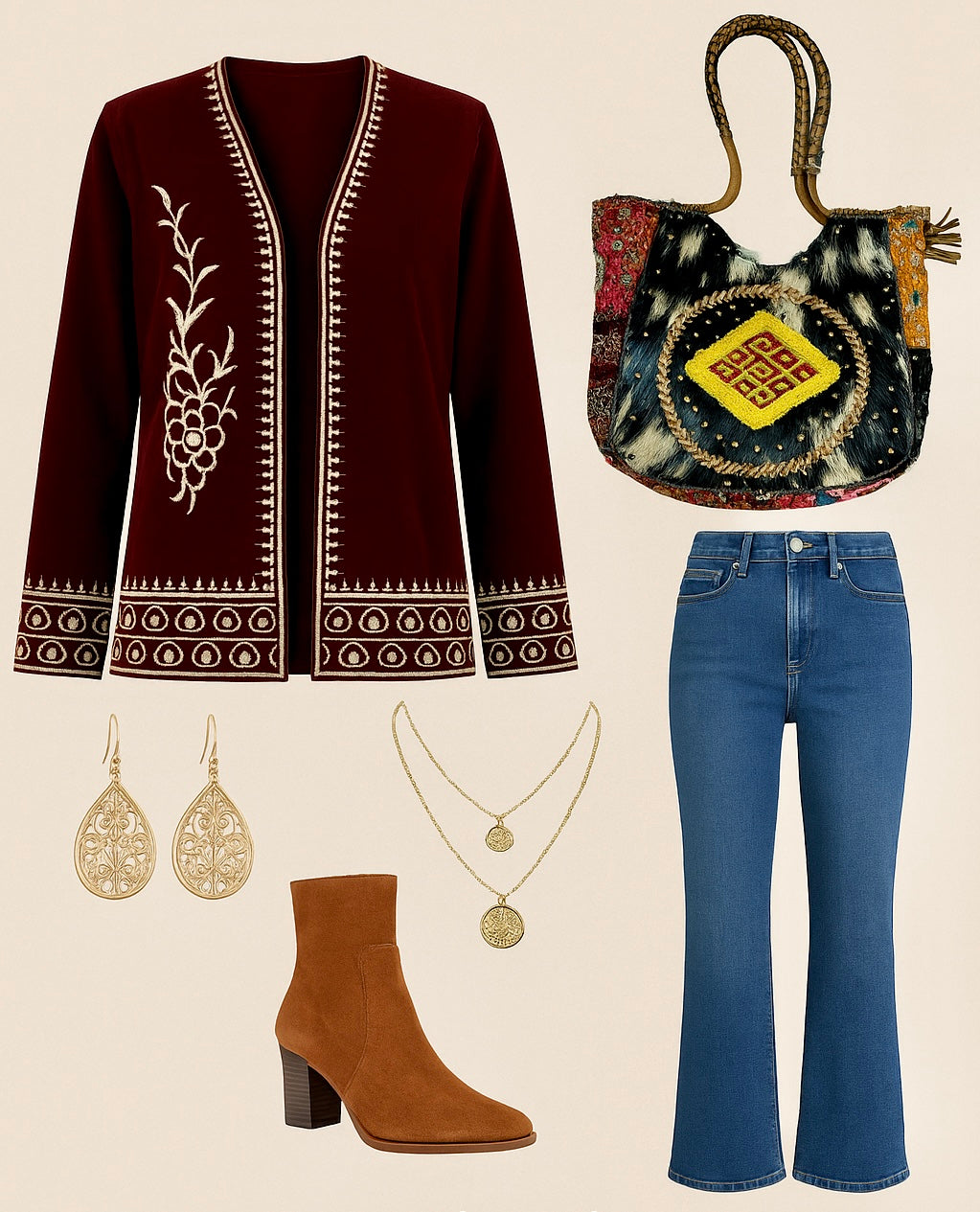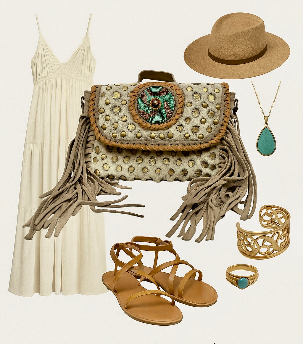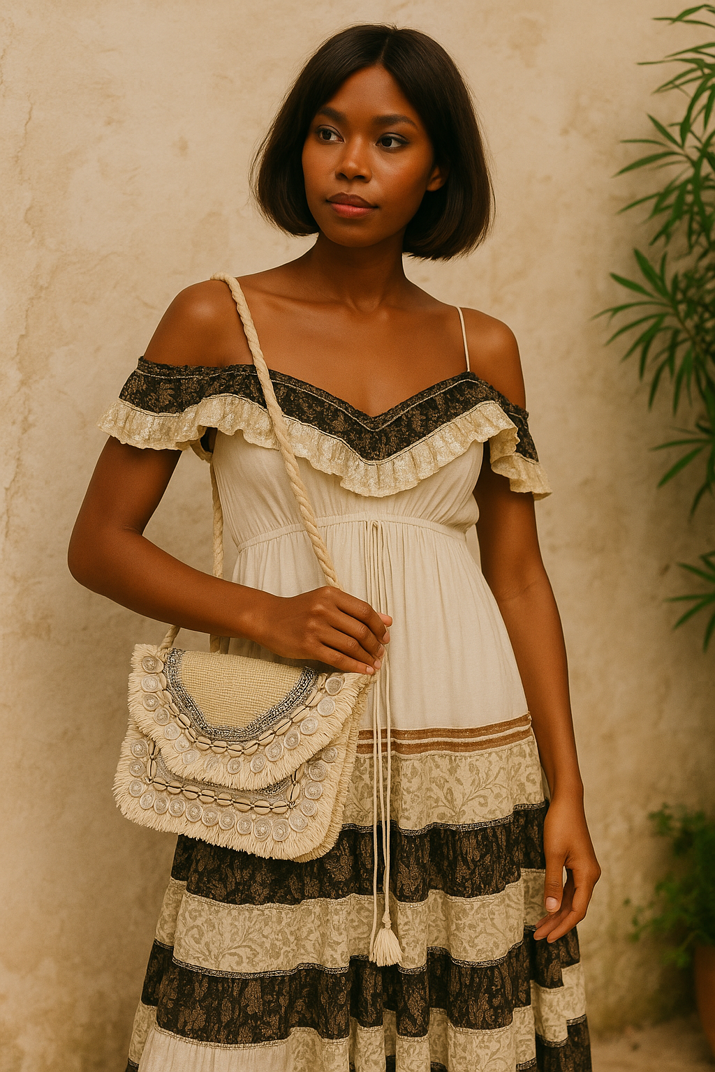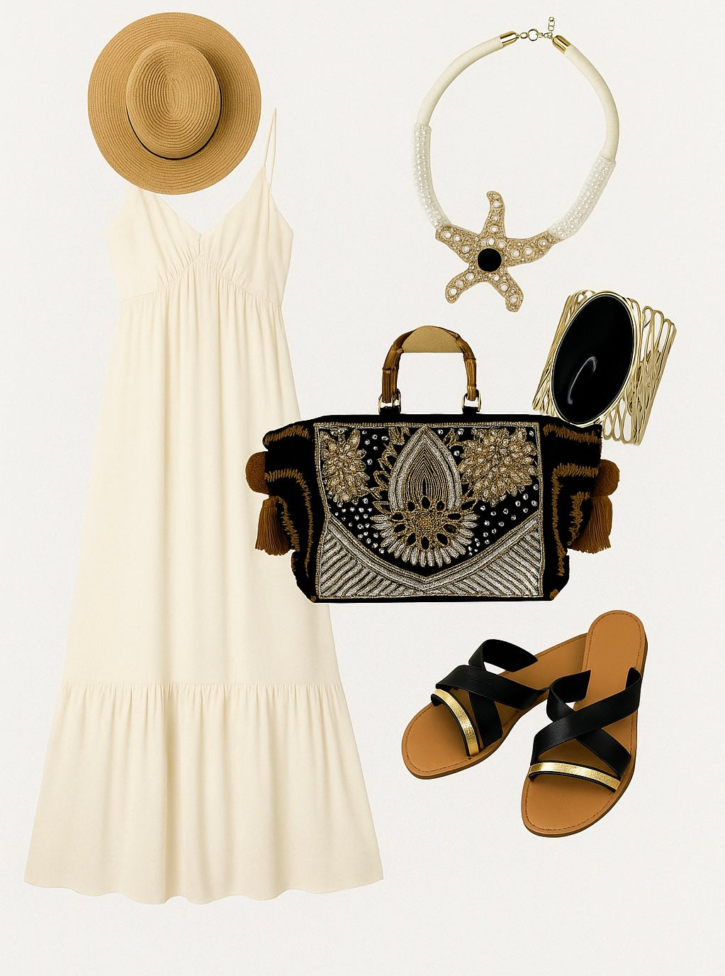 Create an ankle down view of a woman in the filly green embroidered dress on the beach