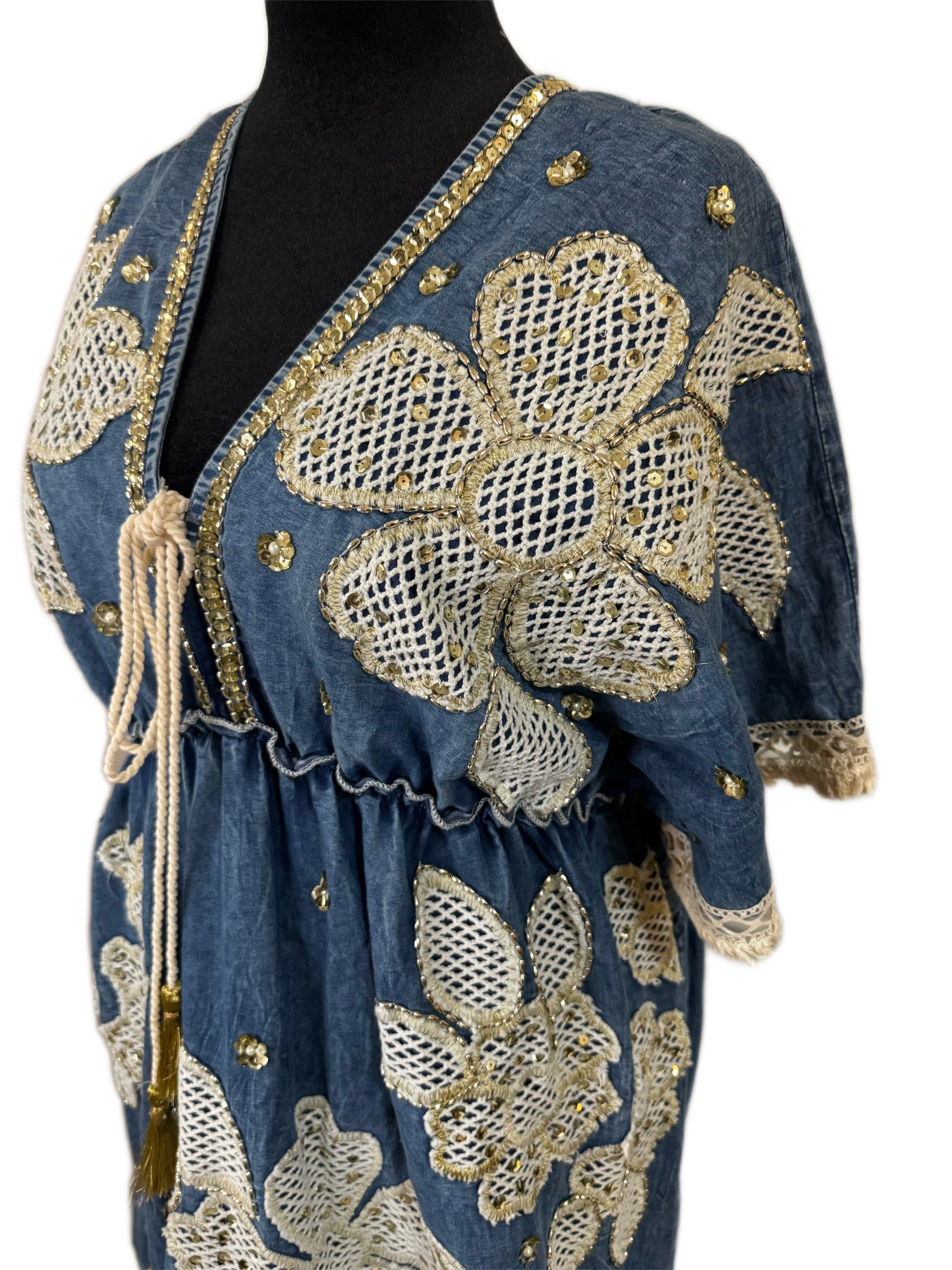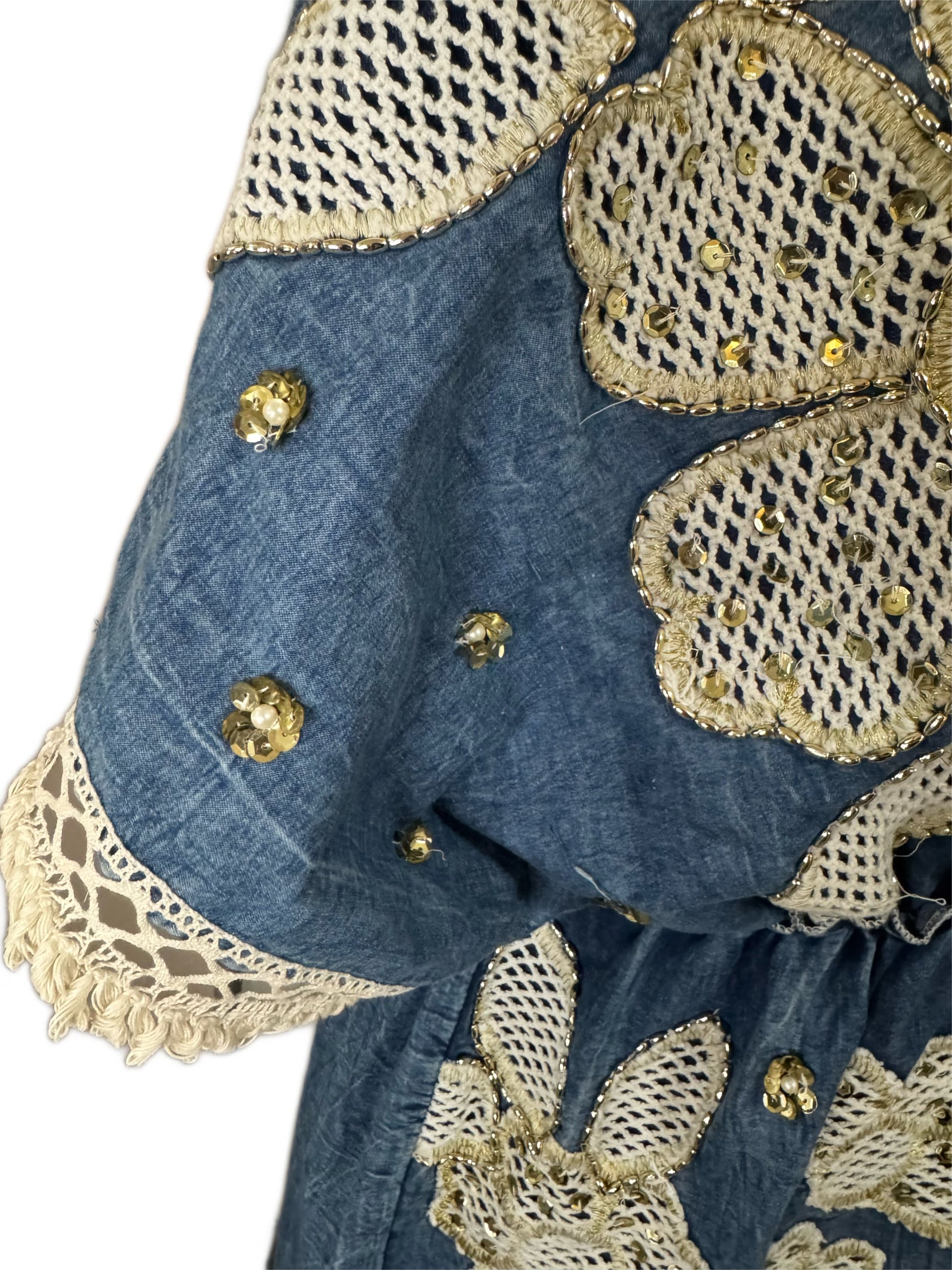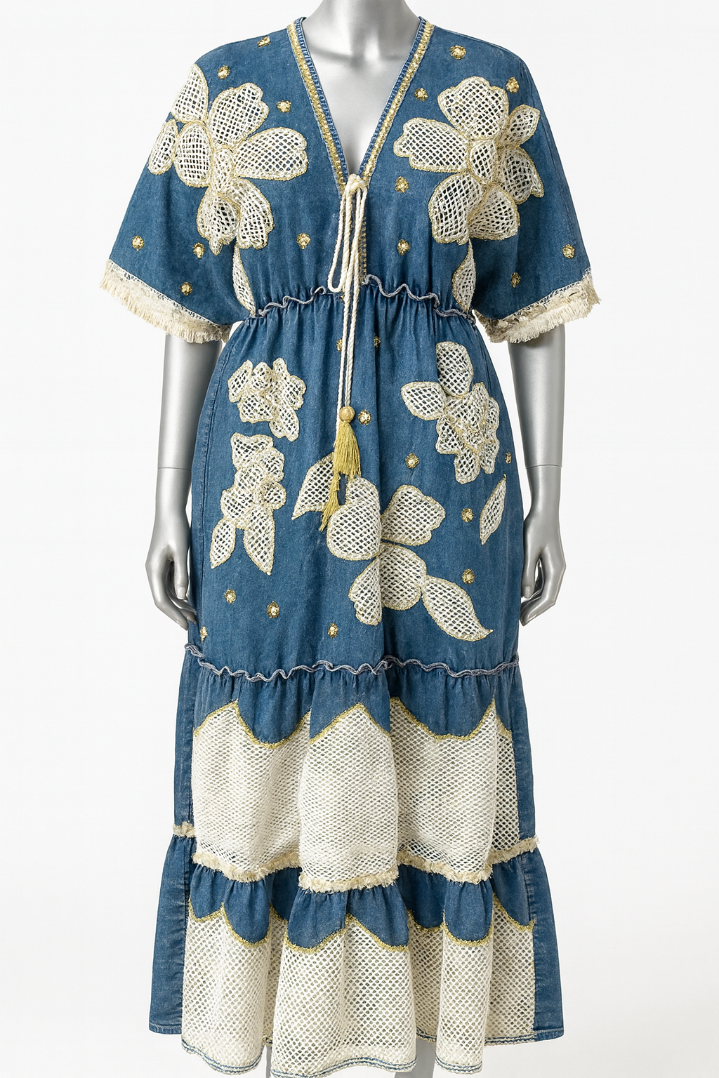 Experience effortless elegance with the Delicate Denim Maxi Dress, where soft denim blends seamlessly with intricate lace detailing. Crafted from 100% cotton, this frilly maxi offers breathable comfort and a flattering silhouette perfect for any occasion. Elevate your wardrobe with a dress that combines casual charm and feminine grace in one stunning piece.
