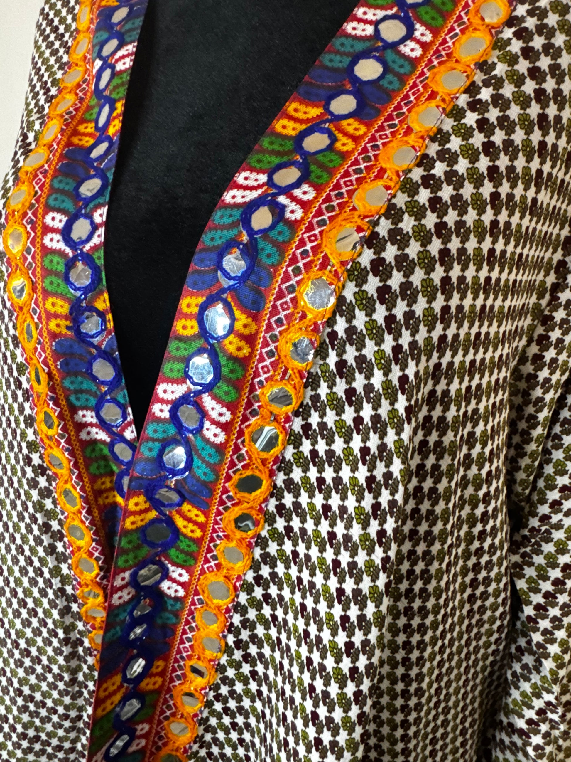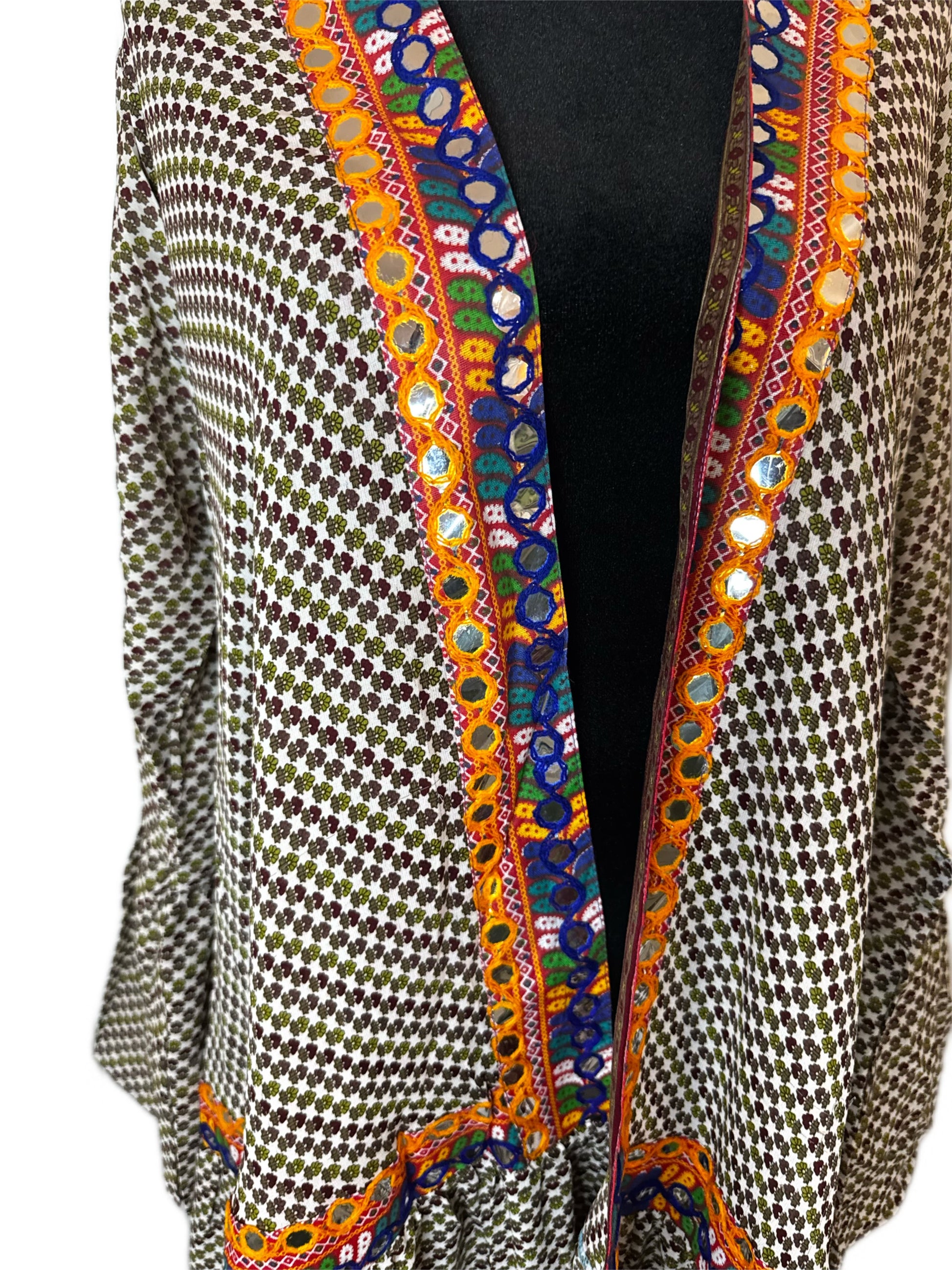 Turn heads with the Mosaic Dreams Kimono & Clutch Set, a one-of-a-kind boho ensemble featuring vibrant embroidery, mirrorwork, and bold patchwork details. Paired with a tasseled statement bag, this look blends artisan craftsmanship with modern flair. Effortlessly chic, it’s perfect for festivals, vacations, or making every day feel like a runway.