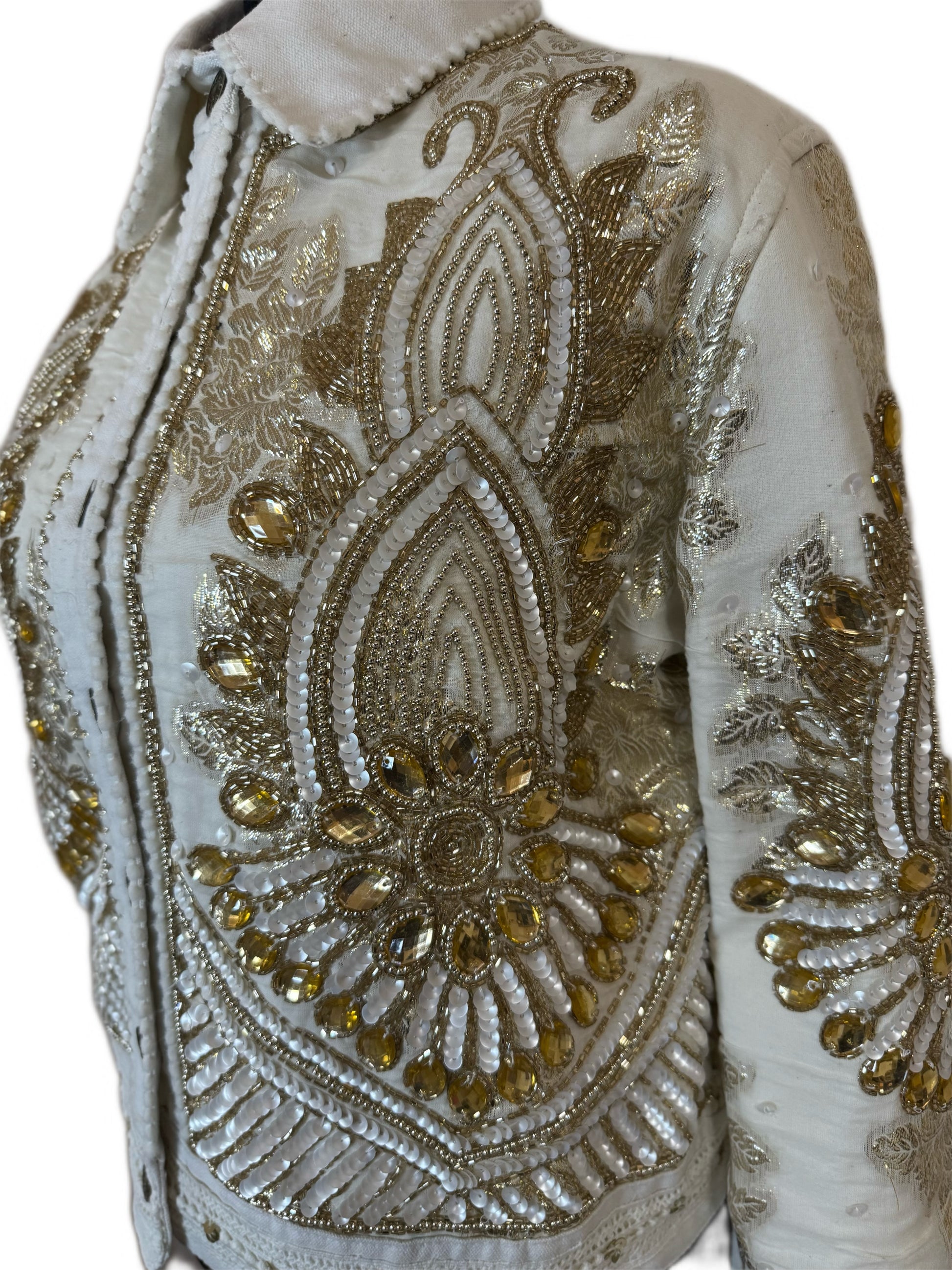 - Premium ivory denim with hand-beaded sequin and brocade embroidery