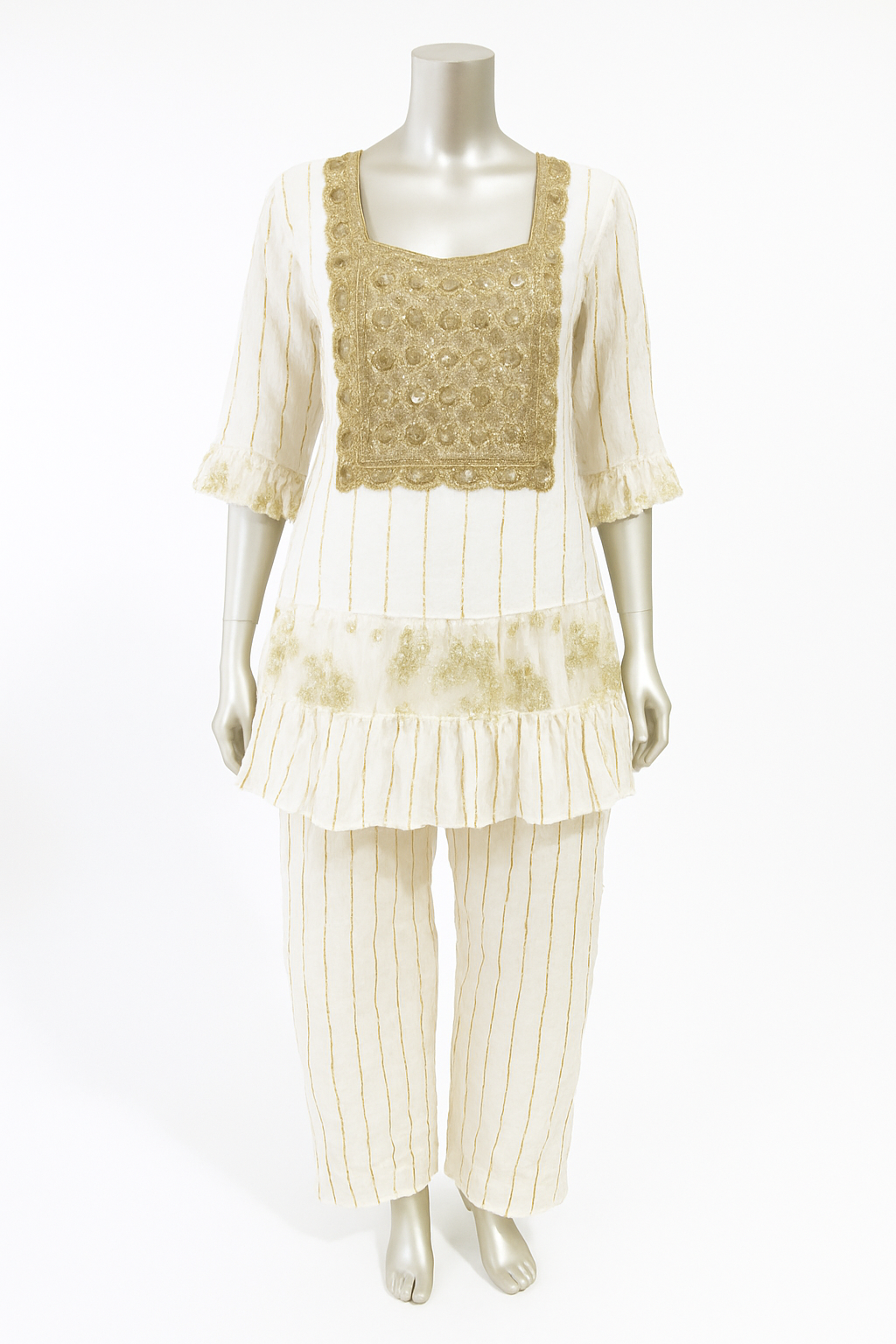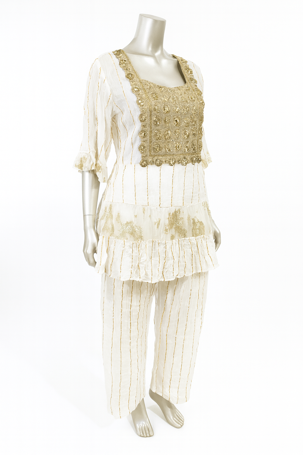 Glowing in ivory and gold, the Nomadic Solstice Set blends timeless grace with bohemian artistry. The lightweight two-piece ensemble features shimmering gold embroidery and mirror-work detailing, designed to catch the light with every step. Perfect for resort evenings, festive gatherings, or elevated everyday wear, it’s a versatile set that radiates effortless elegance.
