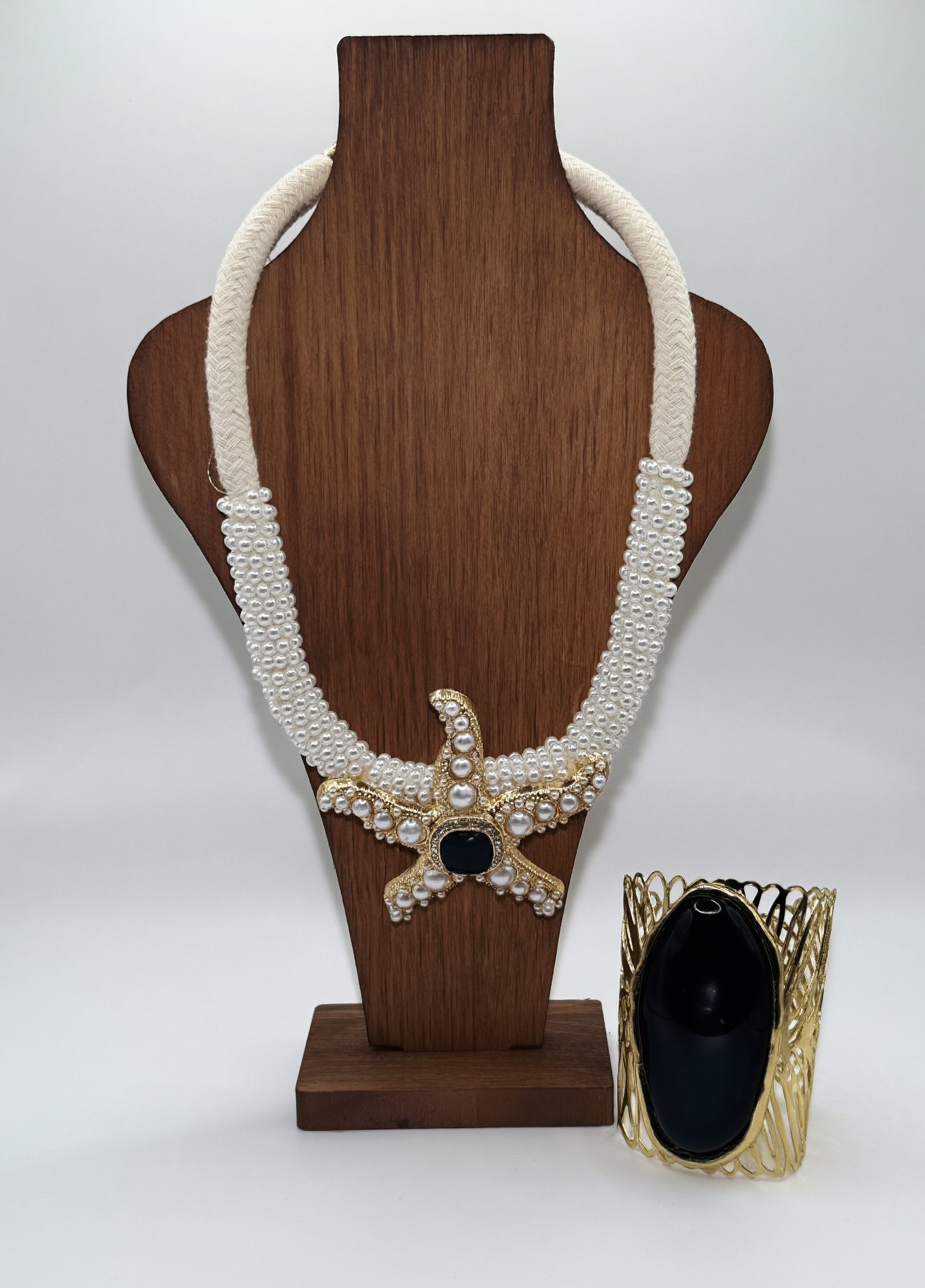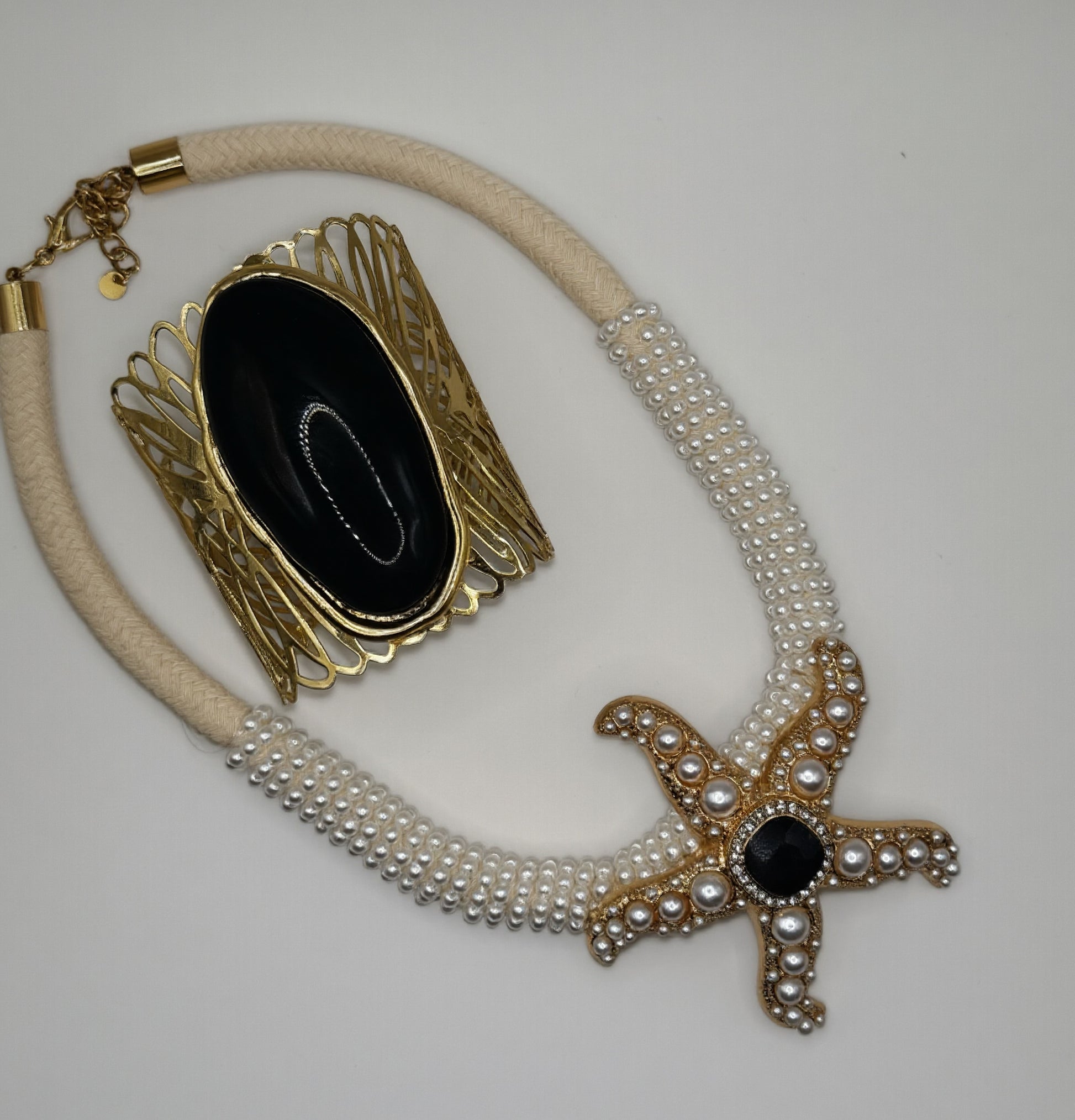 This nautical-inspired jewelry set features a white rope necklace adorned with a gold-tone starfish pendant, embellished with luminous pearls and a striking black center stone. Paired with a bold gold cuff bracelet showcasing an oversized black oval centerpiece, the set blends coastal elegance with contemporary statement style.