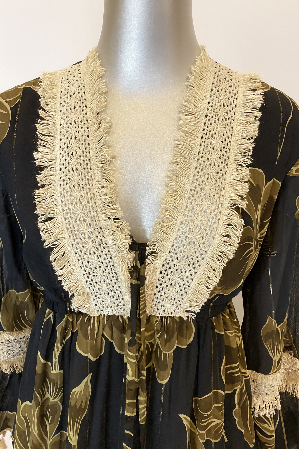 The Midnight Bloom Kimono blends elegance and bohemian charm with its black backdrop adorned in golden floral prints. Delicate cream crochet trim with fringe accents graces the neckline, sleeves, and hem, while playful tassels add movement. Lightweight and breezy, it’s the perfect layering piece for resort wear, lounging, or a stylish evening out.