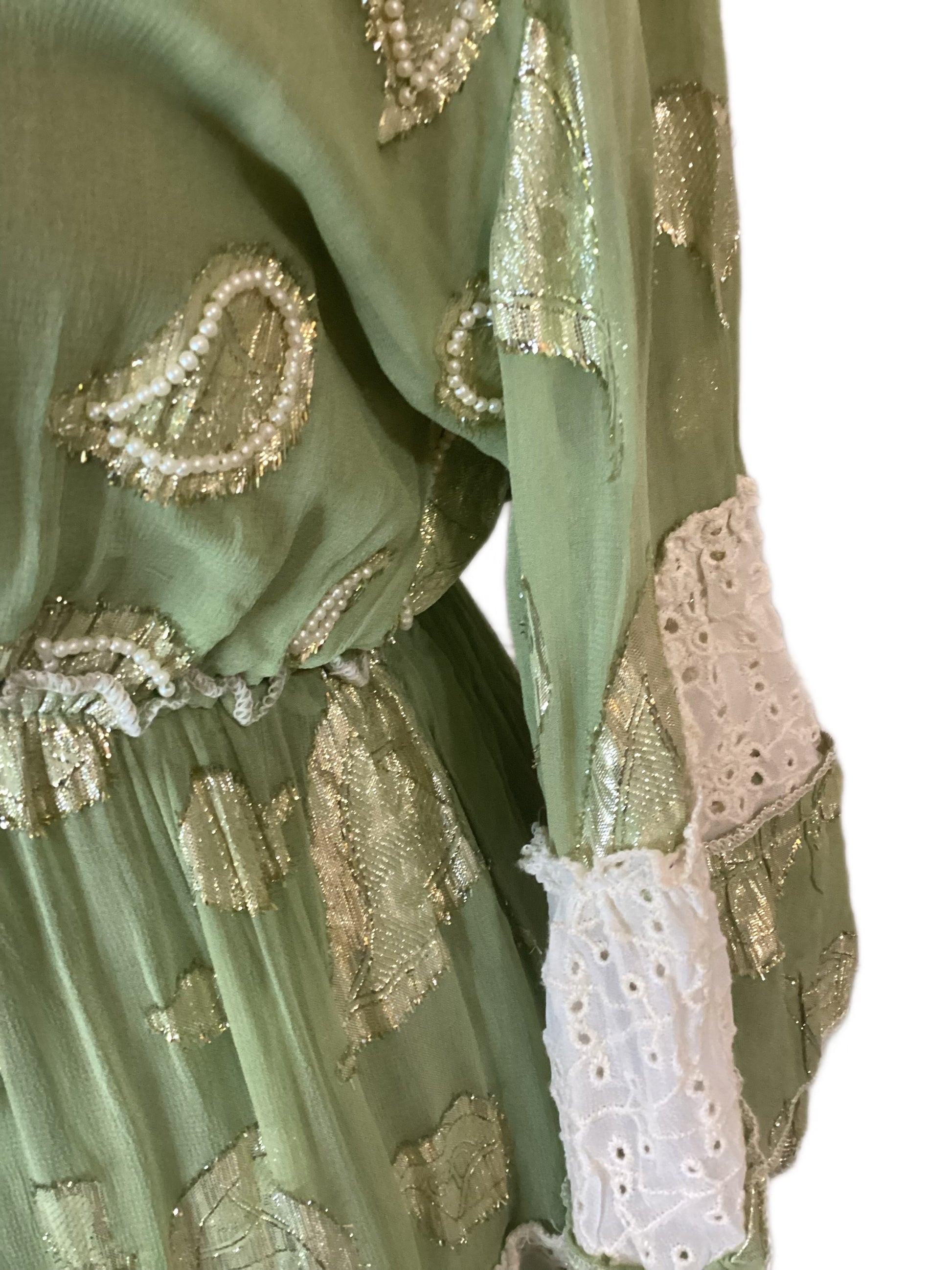 A breezy green dress adorned with shimmering gold accents and delicate white lace panels. Finished with cowrie shell details and tasseled ties, this piece blends boho charm with a touch of luxury—perfect for resort wear or effortless everyday style.