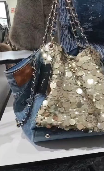 Where laid-back denim meets high-shine glamour — the Denim Diva Sequin Tote is a bold, fashion-forward bag designed to take you from casual days to sparkling nights. With upcycled denim details, shimmering sequin panels, and luxe chain straps, it’s roomy enough for all your essentials while doubling as a statement accessory. A denim pouch is included to keep all your necessities in one place.