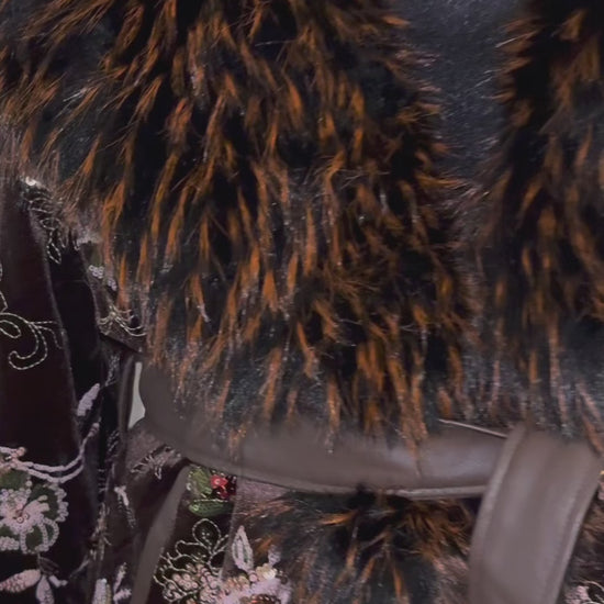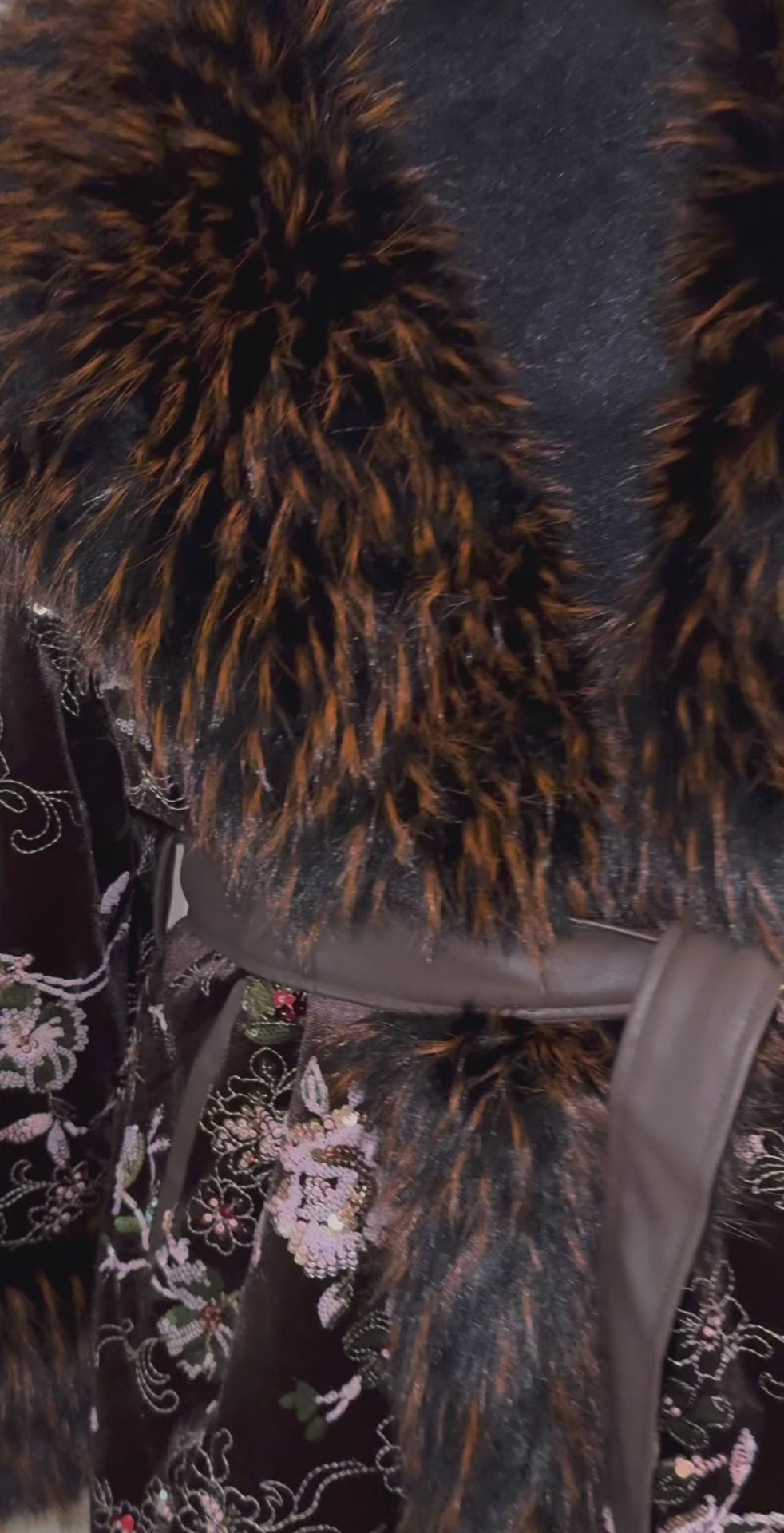 Wrap yourself in opulence with the Velvet Ember Luxe Coat, a show-stopping statement piece crafted for the modern muse. Designed in sumptuous embroidered velvet, it shimmers with intricate floral detailing that catches the light with every move. The voluminous faux fur collar and cuffs in rich ember tones frame the silhouette with warmth and drama, while the soft satin belt cinches the waist for a flattering, feminine fit.